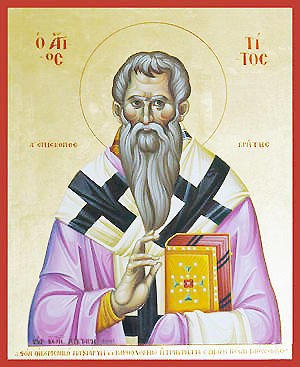 Проходя по многим странам с благовестием имени Христова, святые апостолы пришли в Крит, отечество Тита. Анфипатом же тогда в Крите был Рустил, муж сестры Тита; услыхав проповедь апостольскую о Христе Боге, он первоначально посмеялся ей; но когда умерший его сын воскрешен был апостолом Павлом, то Рустил уверовал во Христа и принял Святое Крещение со всем домом своим; вместе с тем приняли святую веру и Крещение и многие из числа прочих неверных, обитавших на острове том. Святой же Павел поставил блаженного Тита епископом острова Крита и прочих близлежащих островов и, поручив ему новопросвещенных христиан, оставил его там; сам же отравился в другие страны проповедовать имя Христово язычникам. Придя в Никополь, святой Павел написал послание Титу, в коем поучал его благому управлению (паствой): «для того я оставил тебя в Крите, чтобы ты довершил недоконченное и поставил по всем городам пресвитеров, как я тебе приказывал» (Тит.1:5). Объясняя эти слова апостольские, святой Златоуст говорит: «Тит был более искусным из числа всех, бывших с Павлом; ибо, если бы он не был искусным, Павел не поручил бы ему всего острова, не повелел бы окончит недоконченное, не подчинил бы суду его епископов, если бы не надеялся на сего мужа (Тита)».
