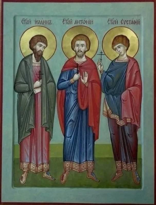Мученическая смерть святых Антония и Иоанна принесла благодатный духовный плод. Родственник святых братьев Круглец, придворный князя Ольгерда, потрясенный стойкостью мучеников, принял Святое Крещение от священника Нестора с именем Евстафий. После крещения Евстафий стал вести истинно христианский образ жизни, исполняя все уставы Православной Церкви. Однажды великий князь, который очень любил своего молодого придворного, заметил, что тот отрастил себе волосы. На вопрос Ольгерда, не христианин ли он, Евстафий открыто исповедал себя христианином. Такое признание привело князя к ярость. Желая отвратить исповедника от Христовой веры. он стал принуждать святого Евстафия съесть мясо. Это было в пятницу Рождественского поста. Святой мученик отказался. Тогда Ольгерд приказал бить юношу железными палками. Но он только славословил и благодарил Бога за то, что Он удостоил его пострадать за Свое Святое Имя. Ожесточенный князь приказал вывести обнаженного святого Евстафия на сильный мороз и лить в его уста ледяную воду. От этой пытки тело страдальца посинело от холода, временами останавливалось дыхание, но он и это мучение вынес с Божией помощью. Ольгерд в бешенстве повелел раздробить ему кости ног от подошвы до колен, сорвать с головы вместе с кожей волосы, отрезать уши и нос. Так мучили святого три дня. Святой Евстафий утешал христиан, плакавших при виде его мучений: «Не плачьте обо мне, братия, что разрушается это земное жилище моей души, потому что вскоре я надеюсь получить для нее у Господа обитель нерукотворенную на небесах».