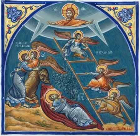 На пути в Харран Иаков имел чудесное видение, именно он видел во сне таинственную лестницу, соединяющую небо с землею, и ему были обещаны благословения Божий, данные Аврааму, и особенное покровительство в жизни (Быт. 28:10-22). По прибытии Иакова в Харран, Лаван принял его благосклонно, и он согласился служить у него семь лет за младшую дочь его, Рахиль. Но по прошествии семи лет Лаван хитростью выдал за него старшую дочь свою, Лию, вместо младшей. Иаков согласился служить еще семь лет за Рахиль, получил ее себе в жены и потом еще несколько времени оставался в услужении у Лавана за условленную плату из скота и весьма разбогател; помимо Лии и Рахили, Иаков взял себе еще в жены двух служанок, Валлу и Зелфу, и таким образом от четырех он имел 12 сыновей (Рувим, Симеон, Левий, Иуда, Иссахар, Завулон, Дан, Неффалим, Гад, Асир, Иосиф, Вениамин) и одну дочь, Дину (Быт. 24, 30:1, Быт. 35:16-19).