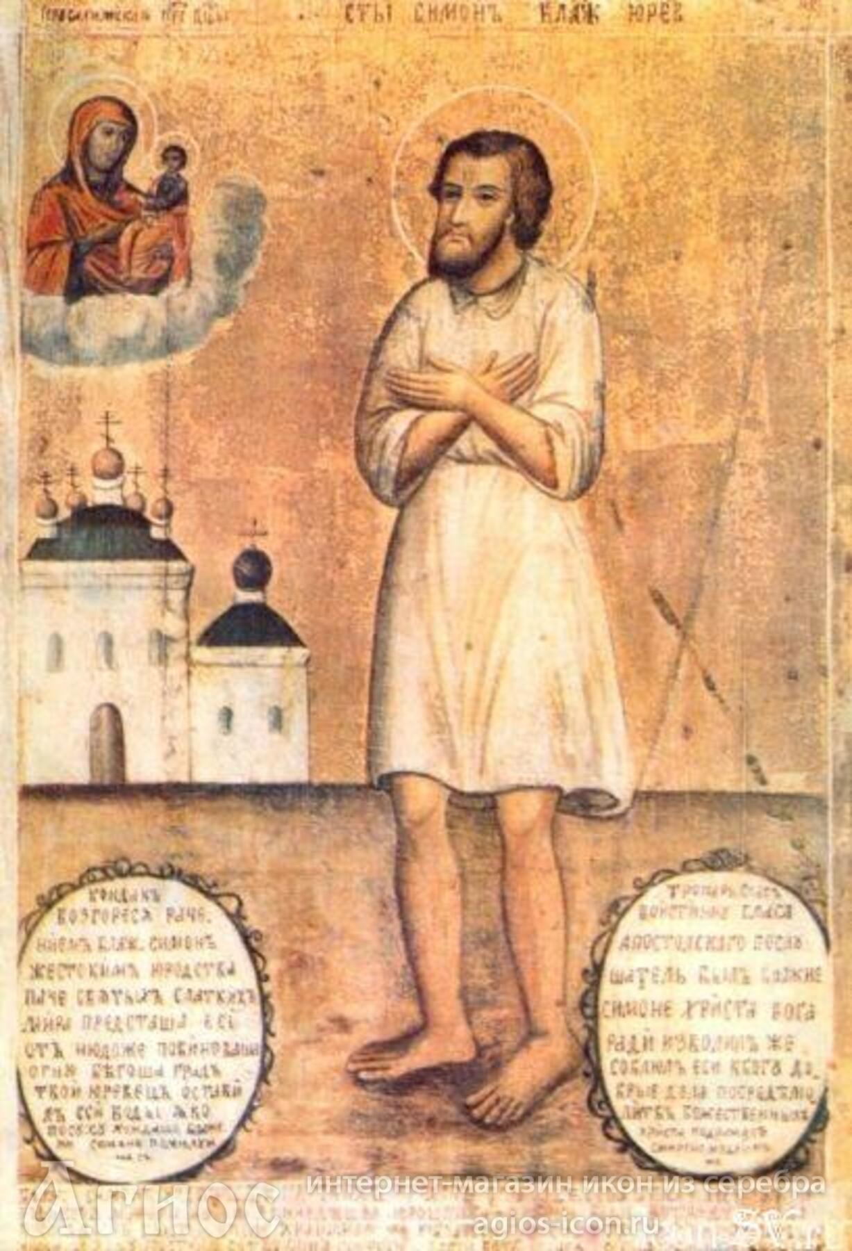 Блаженный Симон Юрьевецкий родился близ города Юрьевца Поволжского. Покинув родителей, он принял на себя подвиг юродства Христа ради. Зимою и летом ходил босой, в одной рубашке, так что кожа его почернела и от поста иссохла. Неразумные люди нередко жестоко били его. Любимым занятием блаженного Симона было молиться на папертях разных церквей. Подвиг самоотречения очистил душу его, и он получил от Бога дар прозрения: многое предвидел и предсказывал будущее. Современники, призывая его имя, видели разные чудесные знамения.