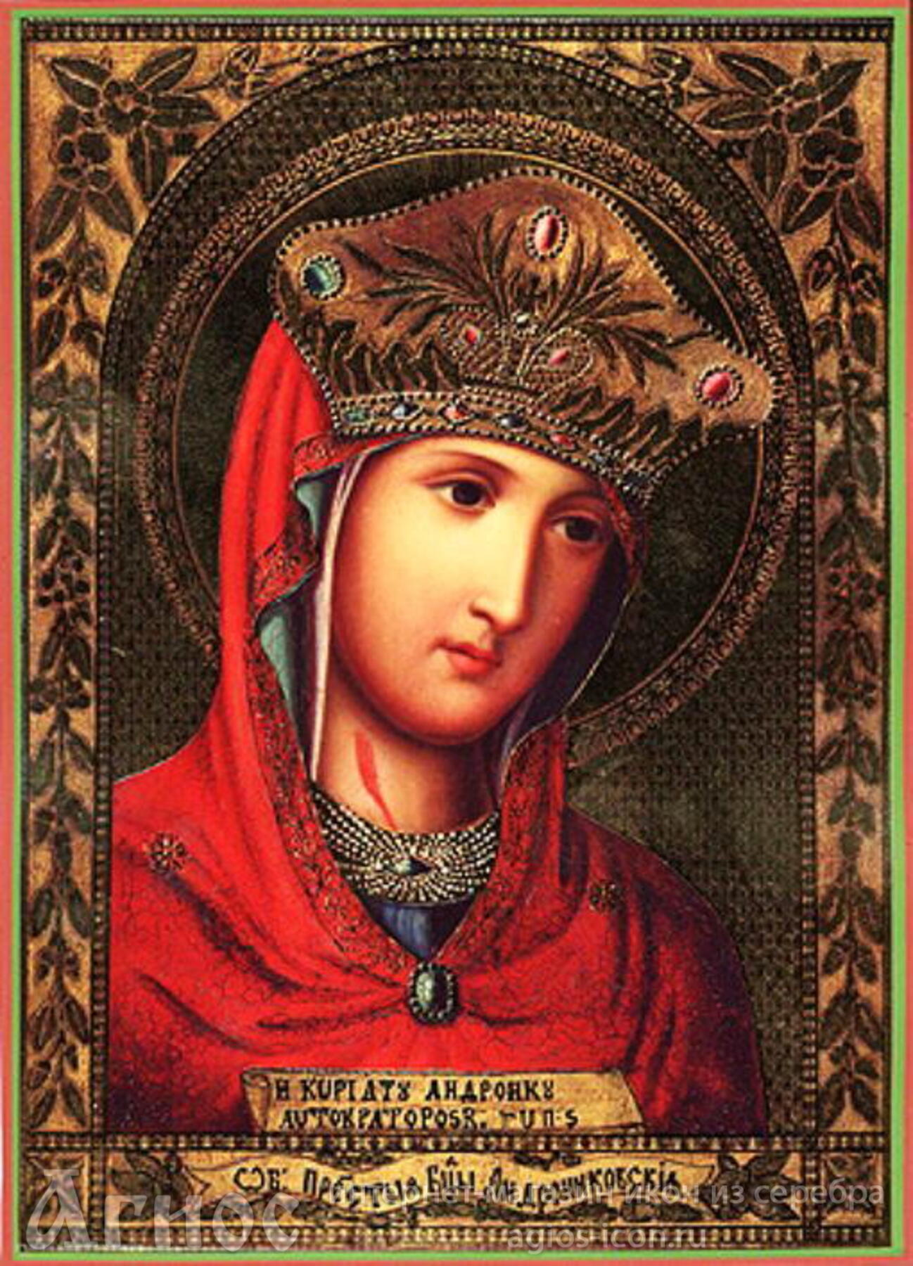 Андрониковская икона Божией Матери, известная также под именами Монемвасийской и Греческой, – родовая святыня греческого императора Андроника III Палеолога, по преданию, одна из написанных апостолом и евангелистом Лукой. По первому сохранившемуся документальному свидетельству об иконе, в 1347 году Андроник пожертвовал ее Монемвасийской обители в Морее, где она пребывала до начала XIX-го столетия. После нападения на Грецию в 1821 году турецких войск, настоятель монастыря, епископ Агапий, пытаясь спасти чудотворную Андрониковскую икону, скрылся с нею в г. Патрас. Перед смертью Агапий завещал эту святыню своему родственнику, русскому генеральному консулу Н. И. Влассопуло, сын которого, А. Н. Влассопуло, в 1839 году переслал икону из Афин в Одессу с письмом на Высочайшее имя для препровождения ее в Петербург императору Николаю Павловичу. С 1839 по 12 мая 1868 года Андрониковская икона находилась в Зимнем дворце, а с 12 мая 1868 года по 16 апреля 1877 г. – в Троицком соборе, что на Петербургской стороне. В 1877 году чудотворная икона была перенесена в Казанский женский монастырь близ города Вышний Волочок Тверской епархии. В 1984 г. икона была украдена и нынешнее ее местонахождение неизвестно.