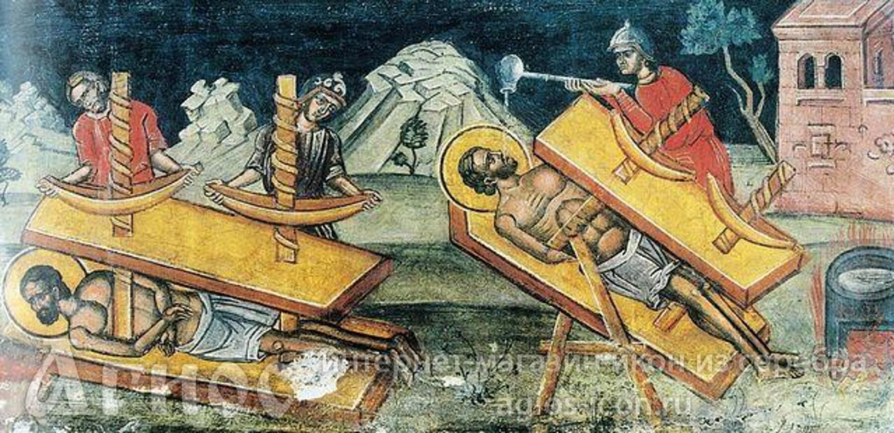Первым пострадал святой Иона. Мученика привязали к дереву и долго избивали, потом волочили по льду замерзшего озера, отрезали пальцы на руках и ногах, отрезали язык, содрали кожу с головы, наконец, перепилили пополам и бросили тело в ров.