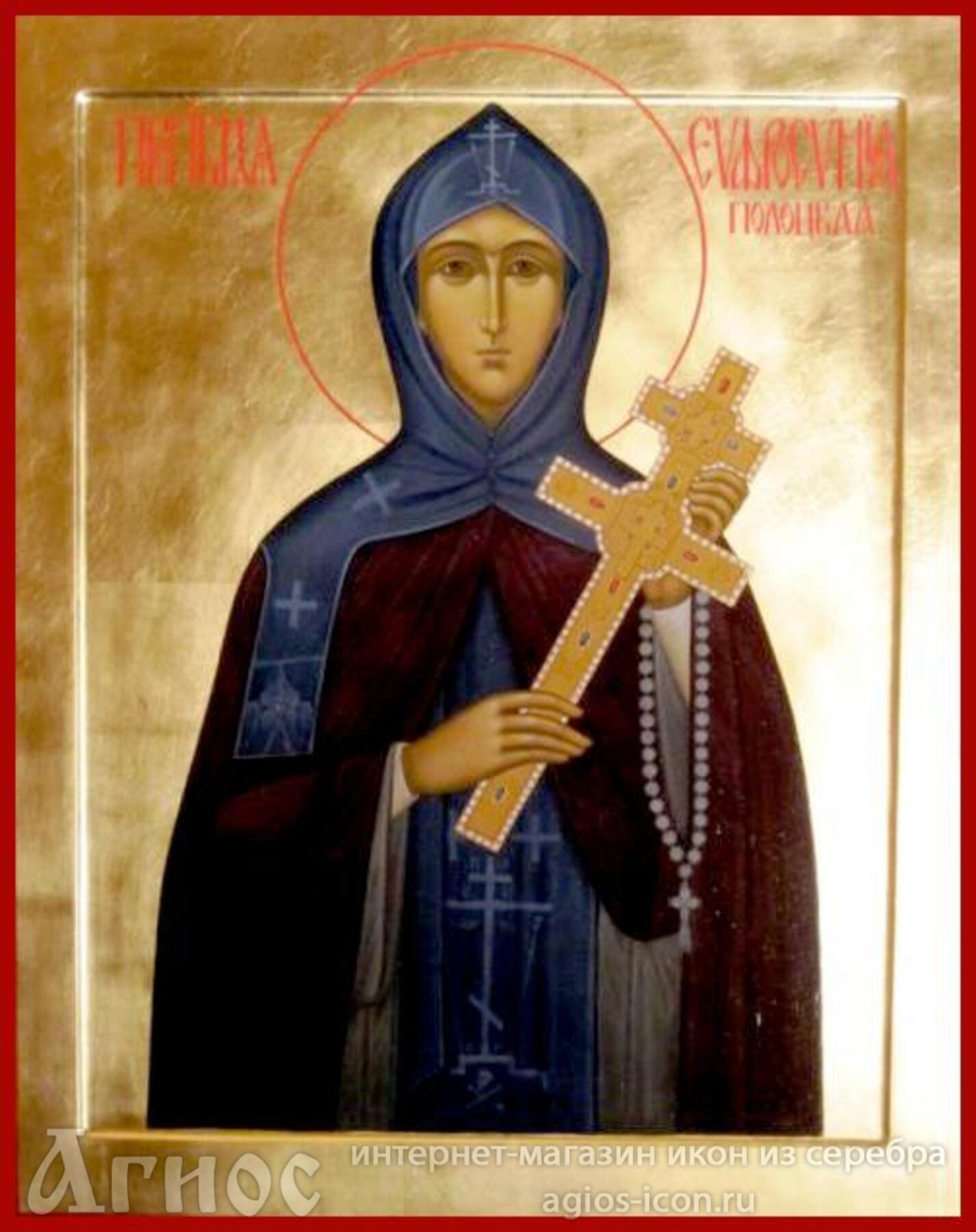 Преподобная Евфросиния, игумения Полоцкая, в миру Предслава. дочь князя Георгия Всеславича. С детских лет она отличалась любовью к молитве и книжному учению. Отвергнув предложения о браке, Предслава приняла постриг с именем Евфросиния. По благословению Полоцкого епископа Илии, она стала жить при Софийском соборе, где занималась переписыванием книг. Около 1128 года епископ Илия поручил преподобной устроить женский монастырь. Отправляясь в Сельцо, - место будущей обители, - подвижница взяла только святые книги - "все свое имение". В новоустроенном Спасо-Преображенском монастыре святая обучала девушек переписыванию книг, пению, шитью и иным ремеслам. В 1161 году ее усердием был построен собор, сохранившийся до нашего времени.