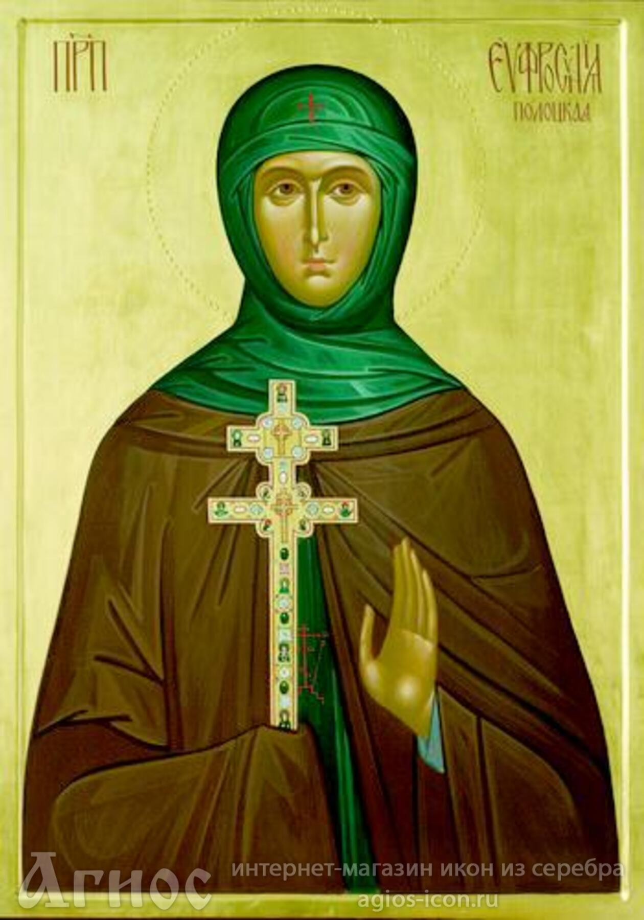 Преподобная Евфросиния, игумения Полоцкая, в миру Предслава. дочь князя Георгия Всеславича. С детских лет она отличалась любовью к молитве и книжному учению. Отвергнув предложения о браке, Предслава приняла постриг с именем Евфросиния. По благословению Полоцкого епископа Илии, она стала жить при Софийском соборе, где занималась переписыванием книг. Около 1128 года епископ Илия поручил преподобной устроить женский монастырь. Отправляясь в Сельцо, - место будущей обители, - подвижница взяла только святые книги - "все свое имение". В новоустроенном Спасо-Преображенском монастыре святая обучала девушек переписыванию книг, пению, шитью и иным ремеслам. В 1161 году ее усердием был построен собор, сохранившийся до нашего времени.
