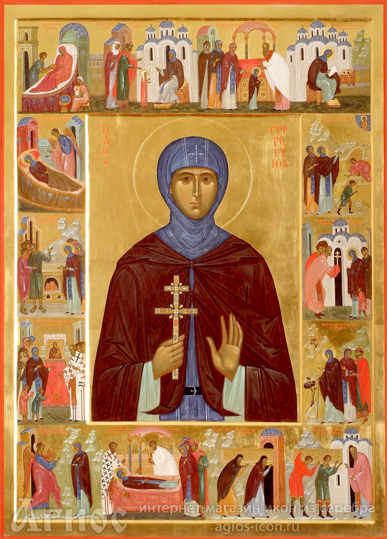 Преподобная Евфросиния, игумения Полоцкая, в миру Предслава. дочь князя Георгия Всеславича. С детских лет она отличалась любовью к молитве и книжному учению. Отвергнув предложения о браке, Предслава приняла постриг с именем Евфросиния. По благословению Полоцкого епископа Илии, она стала жить при Софийском соборе, где занималась переписыванием книг. Около 1128 года епископ Илия поручил преподобной устроить женский монастырь. Отправляясь в Сельцо, - место будущей обители, - подвижница взяла только святые книги - "все свое имение". В новоустроенном Спасо-Преображенском монастыре святая обучала девушек переписыванию книг, пению, шитью и иным ремеслам. В 1161 году ее усердием был построен собор, сохранившийся до нашего времени.