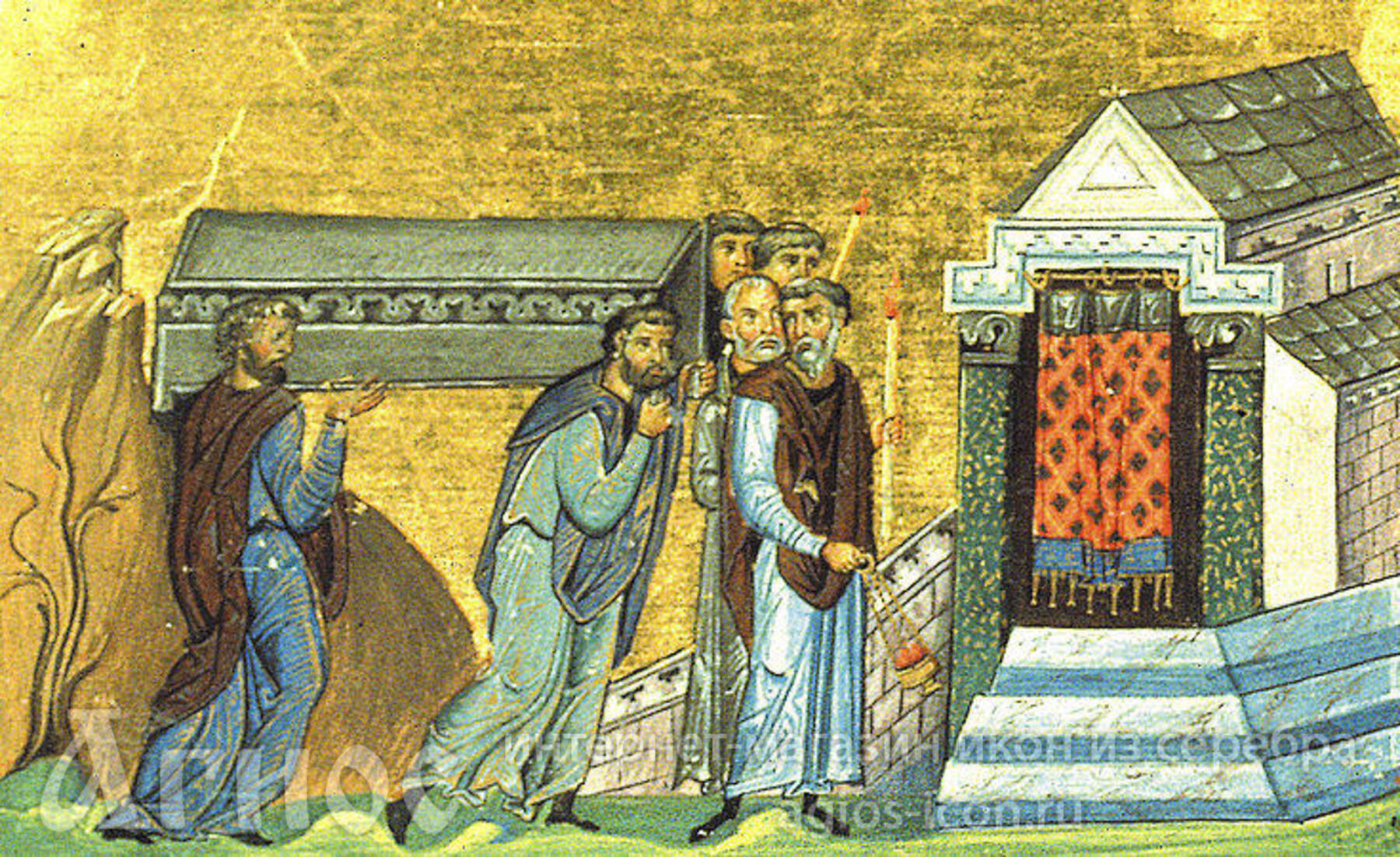 Говоря такие укоризненные слова, нечестивые нередко возлагали на неповинного святого руки, били его немилосердно, терзали за бороду, рвали на нем одежду и не только причиняли ему такие обиды, но и возлагали на плечи и шею его одного такие тяжелые камни, которые едва могли понести четверо. Так, окованный цепями по шее и ногам и тяжко обремененный камнями, трудился угодник Божий. Всякого рода притеснения испытывал святой от знакомых персов во все время, но он все это переносил с радостью ради имени Иисуса Христа.