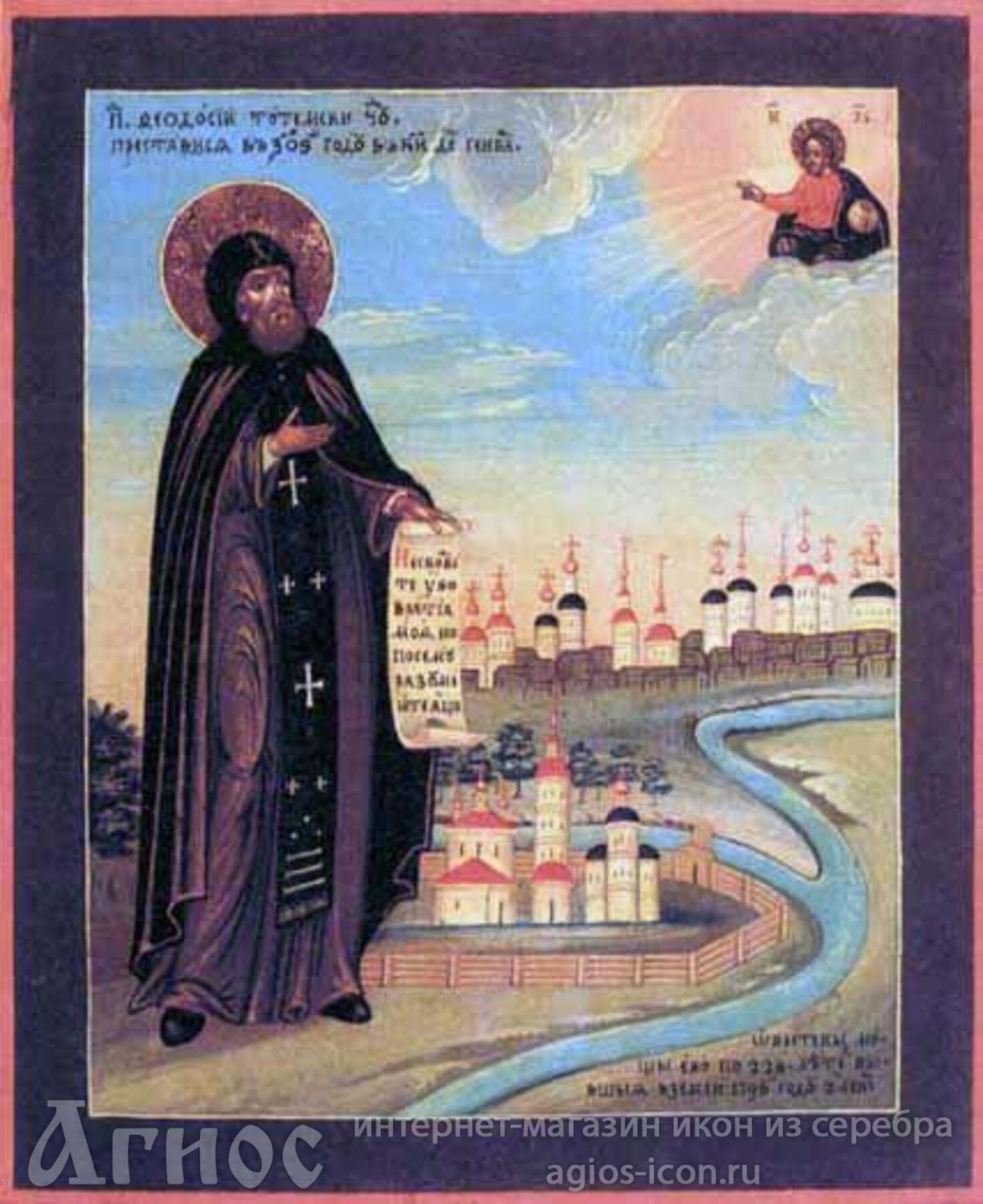 Родился в Вологде около 1530 г. и был воспитан в благочестии и страхе Божием. Достигнув совершеннолетия, по настоянию родителей святой вступил в брак и имел дочь, но семейная жизнь не отвлекала святого от деятельной любви к Богу. Он усердно посещал церковь, много молился дома, особенно ночью. По смерти родителей и супруги, отдав все свое состояние родственникам на воспитание дочери, Феодосий удалился в Вологодский Спасо-Преображенский монастырь преподобного Димитрия Прилуцкого и, приняв здесь постриг, смиренно нес все нелегкие монастырские послушания: колол дрова, пек хлебы, молол муку, исполняя все с усердием.