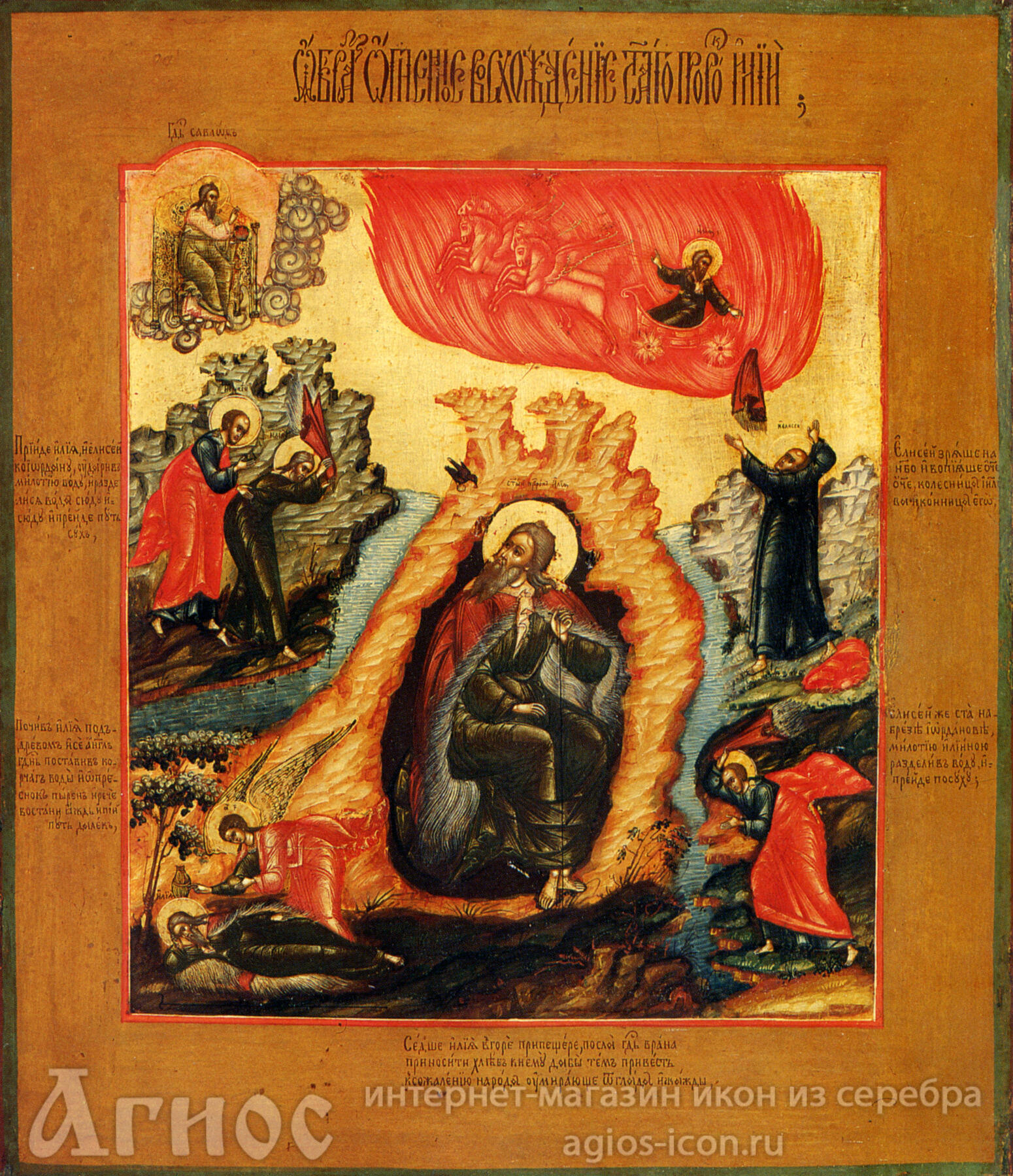 Святитель Епифаний Кипрский сообщает о рождении пророка Илии такое предание: "Когда родился Илия, отец его Совах видел в видении, что благообразные мужи приветствовали его, пеленали огнем и питали пламенем огненным". Данное младенцу имя Илия (крепость Господня) определило всю его жизнь. С малых лет он посвятил себя Единому Богу, поселился в пустыне и проводил жизнь в строгом посте, Богомыслии и молитве. Призванный к пророческому служению при израильском царе Ахаве, пророк стал пламенным ревнителем истинной веры и благочестия. В то время израильский народ отпал от веры своих отцов, оставил Единого Бога и поклонялся языческим идолам, почитание которых ввел нечестивый царь Иеровоам. Особо поддерживала идолослужение жена царя Ахава, язычница Иезавель. Поклонение идолу Ваалу привело израильтян к полному нравственному разложению. Видя гибель своего народа, пророк Илия стал обличать царя Ахава в нечестии, убеждая его покаяться и обратиться к Истинному Богу. Царь не послушал его. Тогда пророк Илия объявил ему, что, в наказание три года не будет ни дождя, ни росы на земле и засуха прекратится только по его молитве. И действительно, по молитве пророка небо заключилось, наступила засуха и голод по всей земле. Народ страдал от нестерпимого зноя и голода. Господь по Своему милосердию, видя страдания людей, готов был пощадить всех и послать дождь на землю, но не хотел нарушить слова пророка Илии, горевшего желанием обратить сердца израильтян к покаянию и возвратить их к истинному Богопочитанию. Сохраняя пророка Илию от рук Иезавели, Господь во время бедствия послал его в сокровенное место у потока Хораф. Хищным воронам Господь повелел приносить пищу пророку, внушая ему тем самым жалость к страждущему народу. Когда поток Хораф высох, Господь послал пророка Илию в Сарепту Сидонскую к бедной вдове, которая страдала вместе с детьми в ожидании голодной смерти. По просьбе пророка она приготовила ему опреснок из последней горсти муки и остатка масла. Тогда по молитве пророка Илии мука и масло с тех пор не истощались в доме вдовы на протяжении всего голода. Силою своей молитвы великий пророк сотворил другое чудо - воскресил умершего сына этой вдовы. По прошествии трех лет засухи Милосердый Господь послал пророка к царю Ахаву для прекращения бедствия. Пророк Илия велел собрать на гору Кармил весь Израиль и жрецов Ваала. Когда народ собрался, пророк Илия предложил соорудить два жертвенника: один - от жрецов Ваала, другой - от пророка Илии для служения Истинному Богу. "На который из них спадет огонь с неба, тот будет указанием, чей Бог истинен, - сказал пророк Илия, - и все должны будут поклониться Ему, а не признающие Его будут преданы смерти". Первыми приступили к жертвоприношению жрецы Валла: они взывали к идолу с утра до вечера, но напрасно - небо молчало. К вечеру святой пророк Илия воздвиг свой жертвенник из 12-ти камней, по числу колен Израилевых, возложил жертву на дрова, приказал выкопать вокруг жертвенника ров и повелел поливать жертву и дрова водой. Когда ров наполнился водой, пламенный пророк обратился к Богу с горячей молитвой и прошением, чтобы Господь ниспослал с неба огонь для вразумления заблуждающихся и ожесточившихся израильских людей и обратил сердца их к Себе. По молитве пророка с неба сошел огонь и попалил жертву, дрова, камни и даже вод