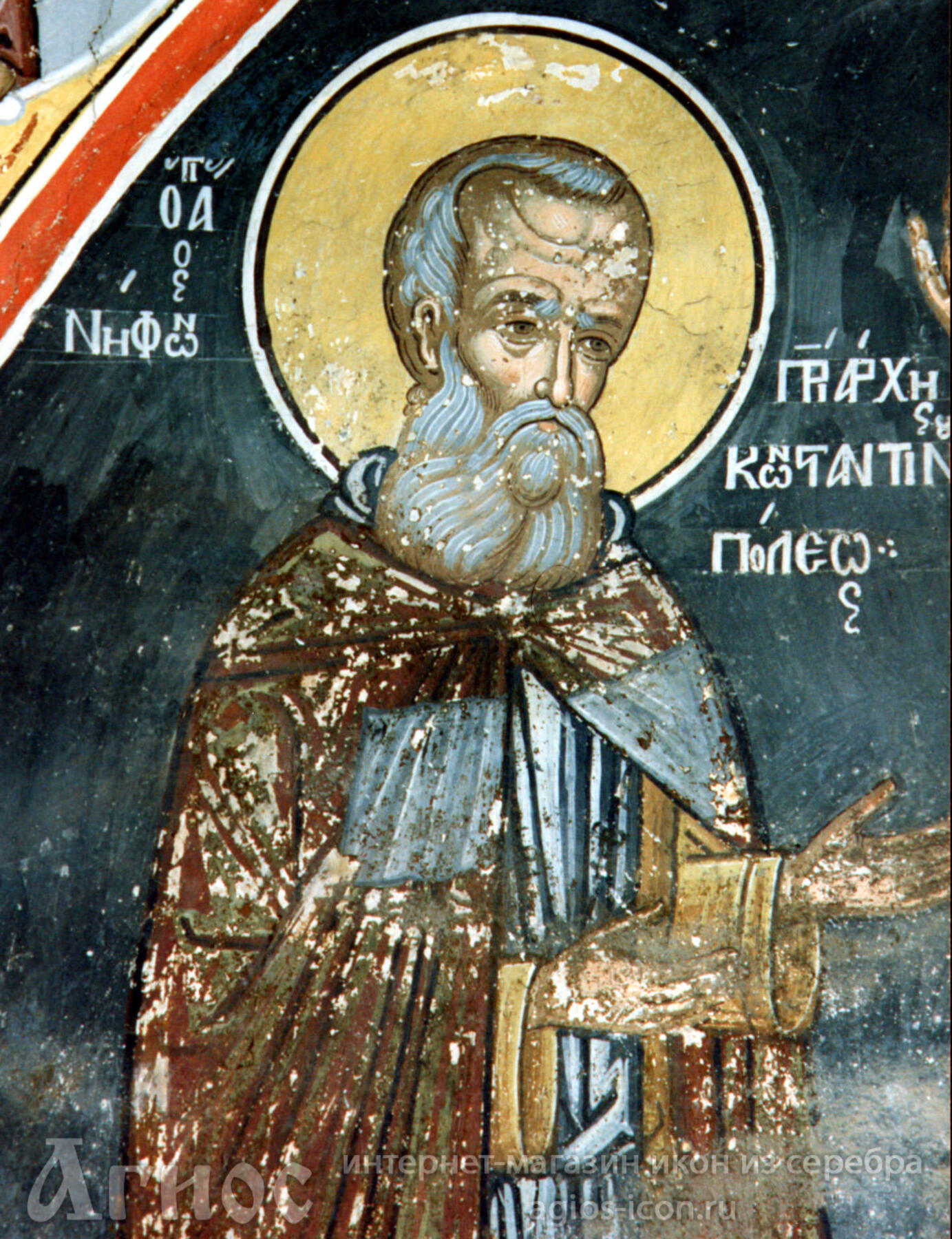 Святитель Нифонт, Патриарх Константинопольский, был родом из Греции, принял монашество в Епидаврионе. После смерти своего старца Антония он удалился на Афон, где занимался перепиской книг. Впоследствии святитель был избран митрополитом Солунским, затем занимал патриарший престол в Константинополе и был первосвятителем Валахии. Изгнанный за обличения, святитель удалился на Афон сначала в Ватопедскую обитель, а затем в обитель святого Иоанна Предтечи (Дионисиат). Он скрыл свой сан и исправлял низшие должности. По особому откровению его сан был открыт братии обители. Однажды, когда святитель возвращался из леса, куда ездил за дровами, вся братия вышла к нему навстречу и торжественно приветствовала как Патриарха. Но и после этого святитель разделял с братией равные труды.