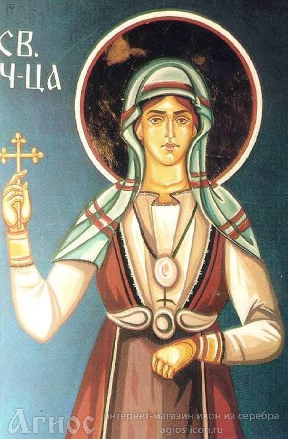 Видя же иноверные, а с ними и тот злой влюбленный в девицу, что они ничего не достигли и не отклонили святой от веры во Христа даже и теми средствами, какие использовали, они оставили уговоры и слова и начали мучить святую. Целых три месяца ее били каждый день. Потом, содрав с нее кожу и вырезав из кожи ремни, оставили их развешанными вокруг мученицы, чтобы она испугалась, видя их. Кровь текла ручьями из ее девического тела, так что вся земля вокруг стала красной. После чего, раскалив острие, они пронзили через уши насквозь голову святой , так что дым выходил из ее носа и рта.